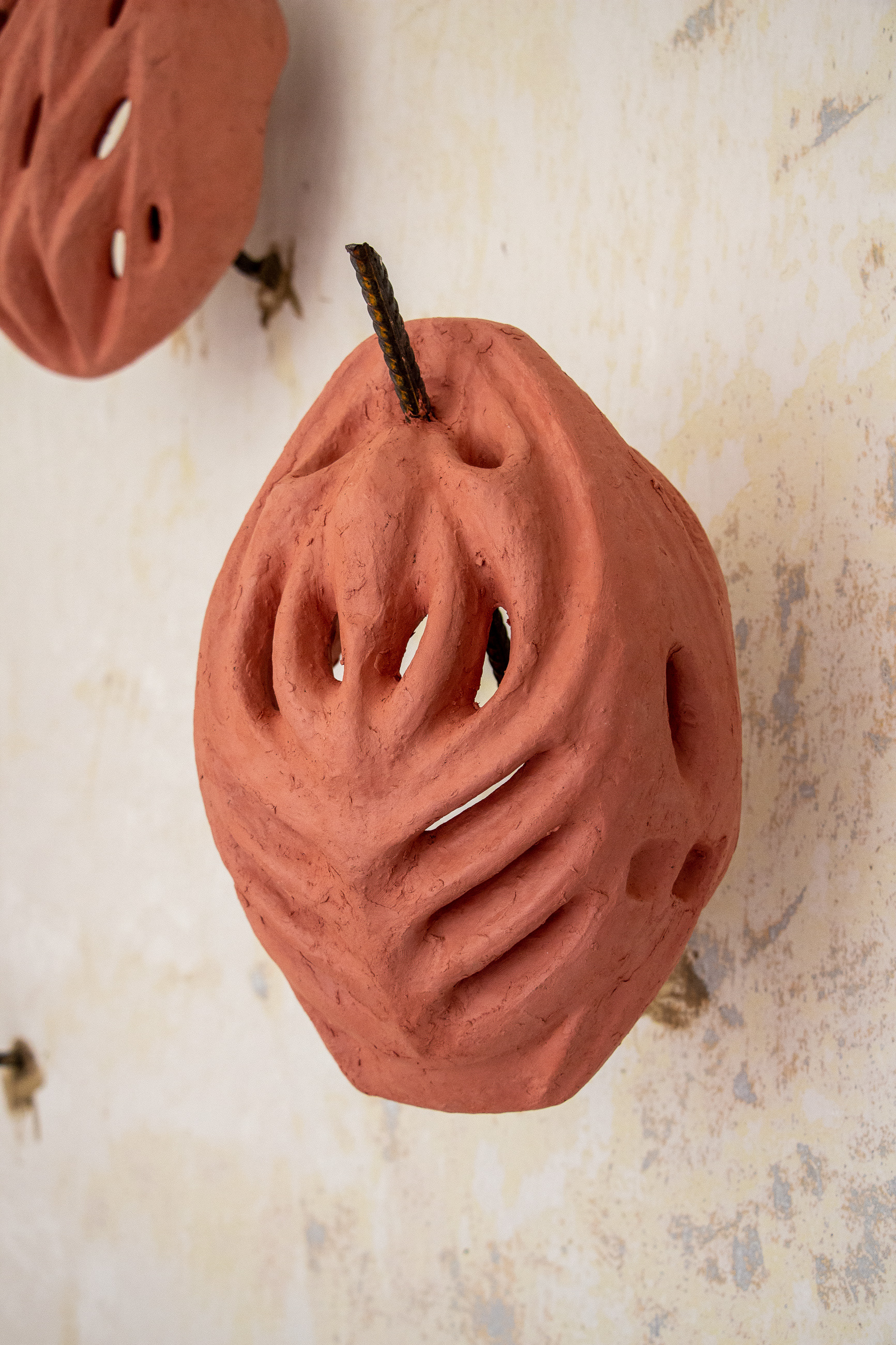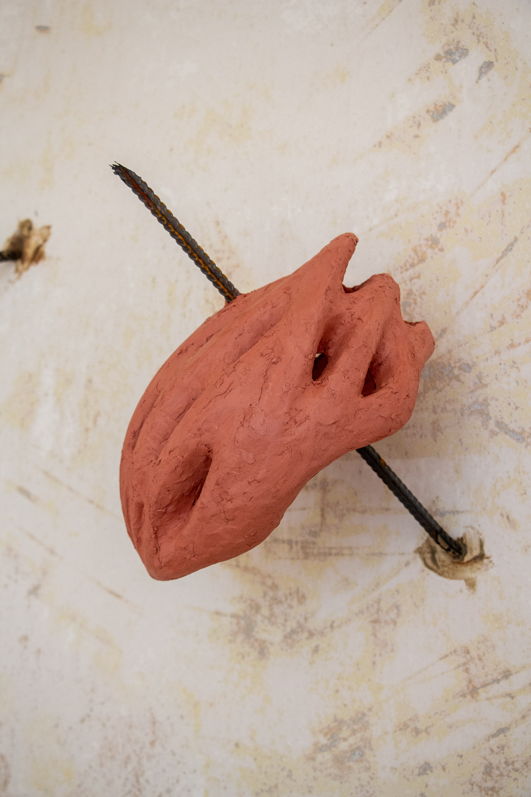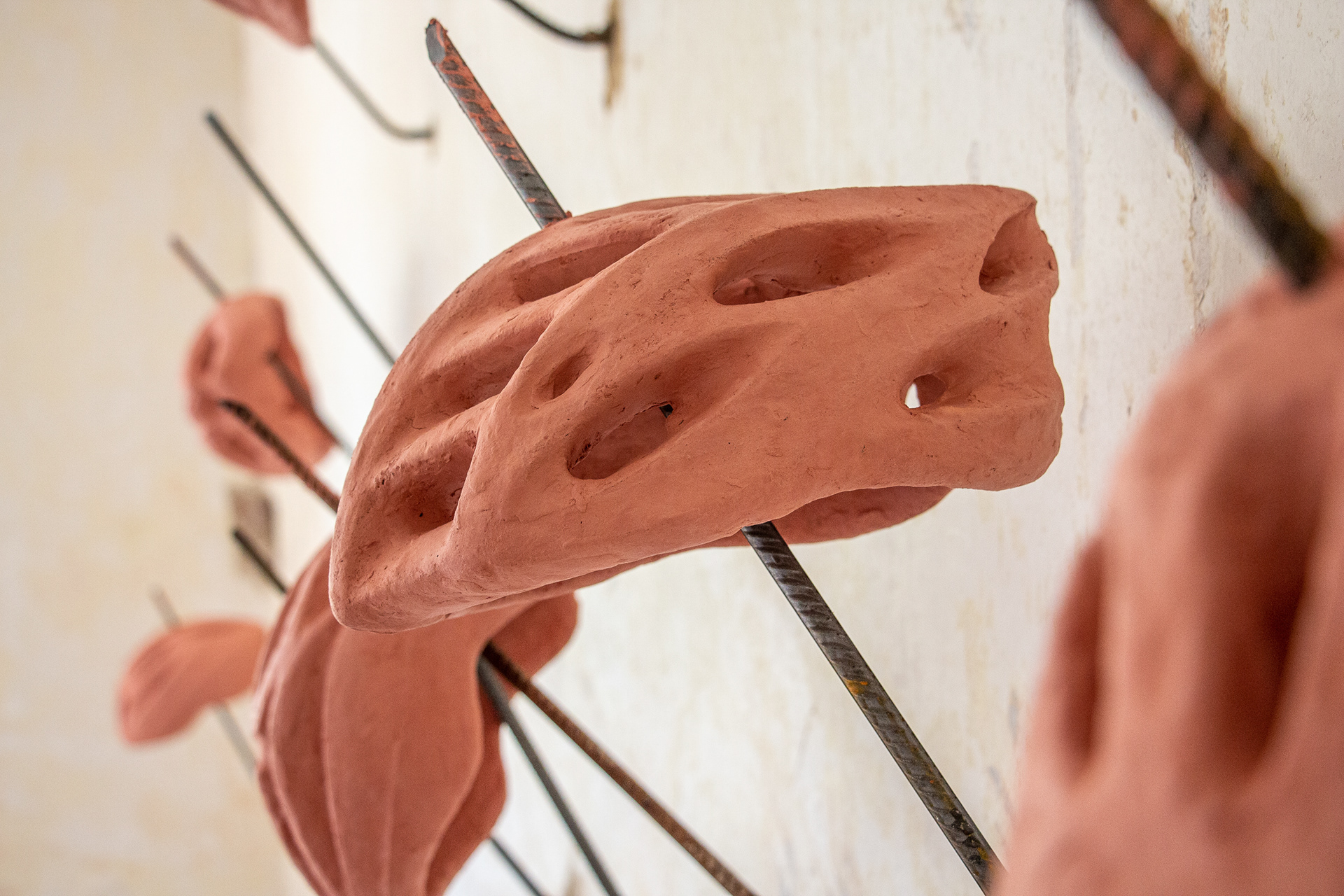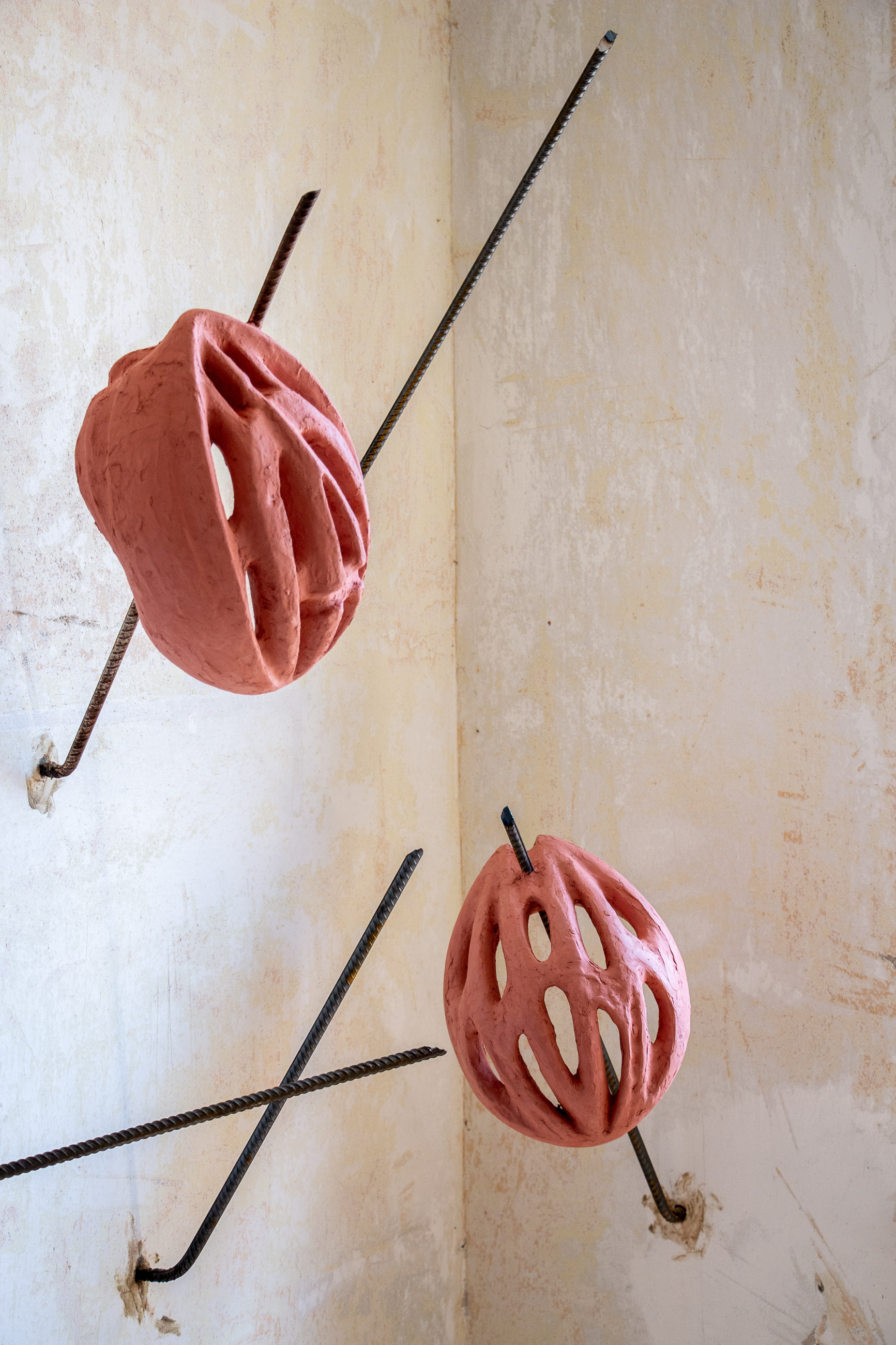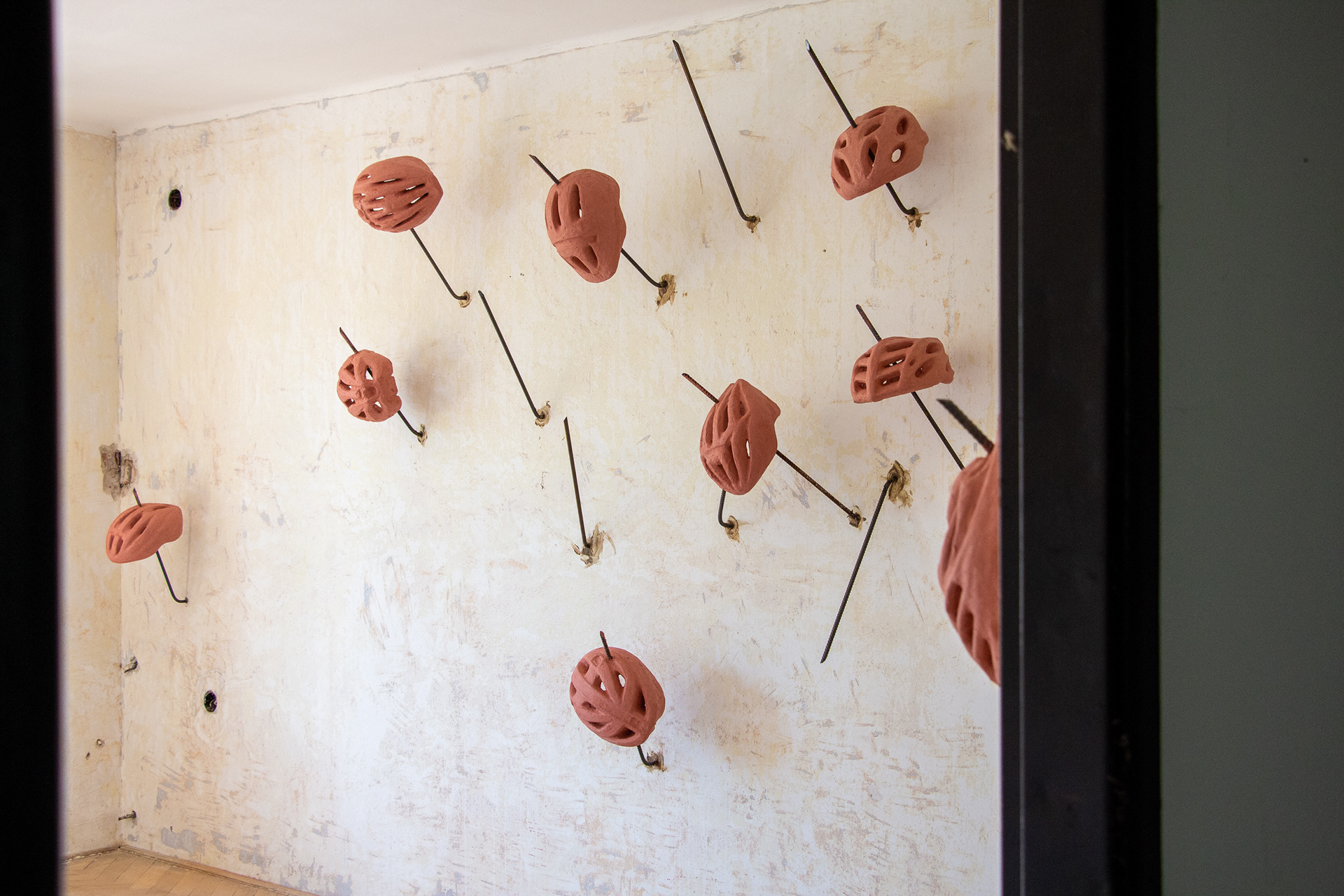 19 used bicycle helmets, hardening terracotta clay, used bicycle helmets, rebar rods,